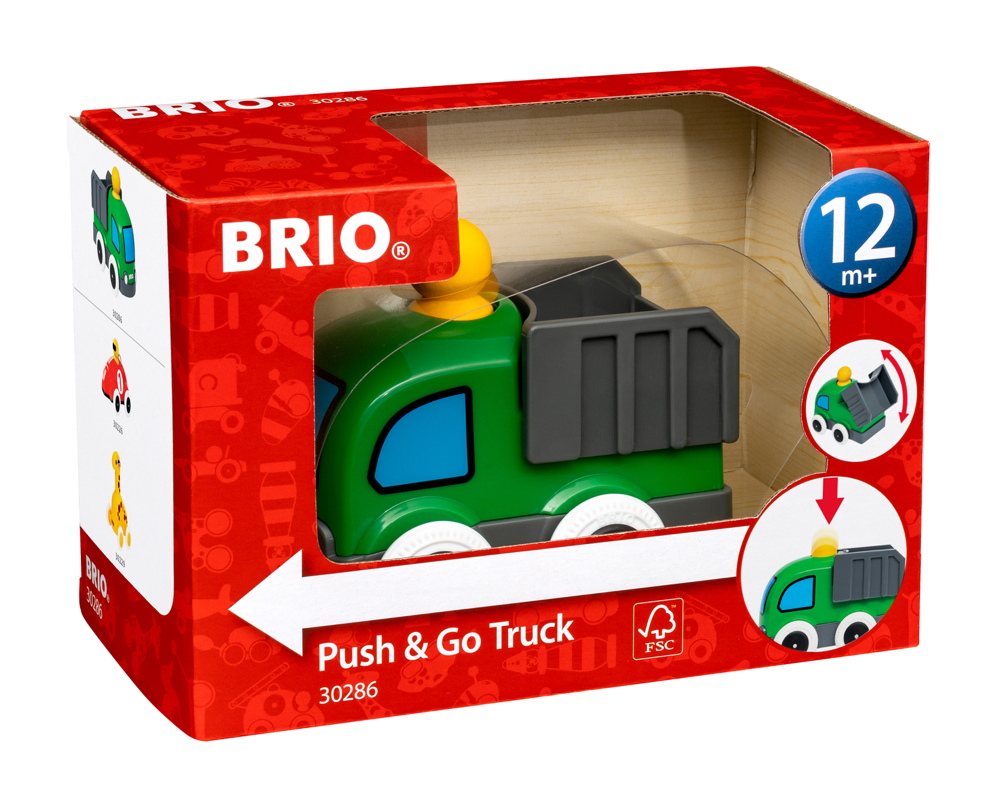 Here comes the 30286 Push & Go Truck – a playful toy truck for toddlers who are learning to crawl and walk. Simply push down the head of the driver and off it goes! Chase it down and let the fun begin again. This fun truck also features a working container so you can load, transport and unload your toys. Made from a combination of FSC-certified European beech wood and high-quality plastics, the simple cause and effect mechanic of this toy is bound to put a smile on everyone’s face.