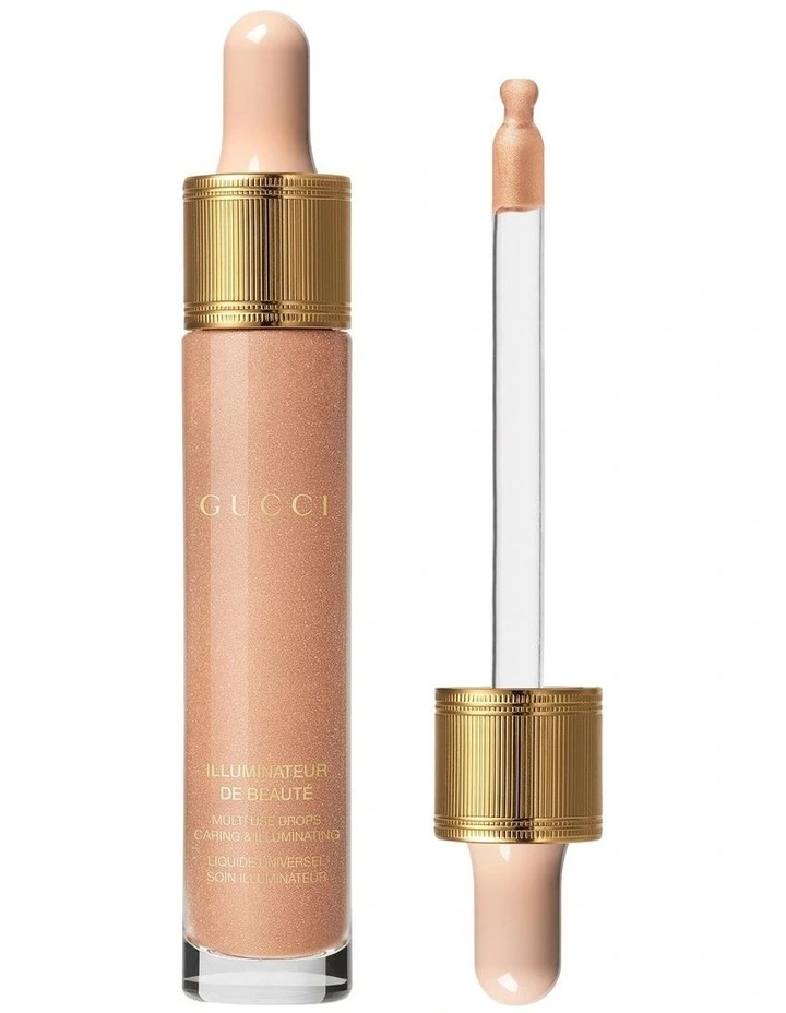 Gucci Beauty presents Gucci Illuminateur de Beauté, the House's first liquid face highlighter. These illuminating multi-use drops create a natural radiant, healthy-looking glow for a result that lasts all day. Expertly blended with ultra-fine luminous pearls and Black Rose extract, this glowing formula cares for the skin as it provides all day soothing & hydration. Available in one universal shade to flatter all skin tones. The Formula Enriched with ultra-fine luminous pearls, the formula creates a radiant, healthy-looking glow. It is infused with a unique floral bouquet of Daisy, Lily and Black rose that offers skin hydration and soothing properties. The Range Gucci Illuminateur de Beauté is available in one exquisite gold shade, designed to flatter all skin tones: a universal highlighter shade for a truly unique glow. The Packaging A makeup product that doubles up as a collectable object to be displayed, Gucci Illuminateur de Beauté is encased in an elegant glass bottle with a vintage feel. A gold ribbed ring at the neck and hot gold stamping on its glass evokes the item’s beauty and opulence, while its pink dropper ensures easy application of the golden liquid within.