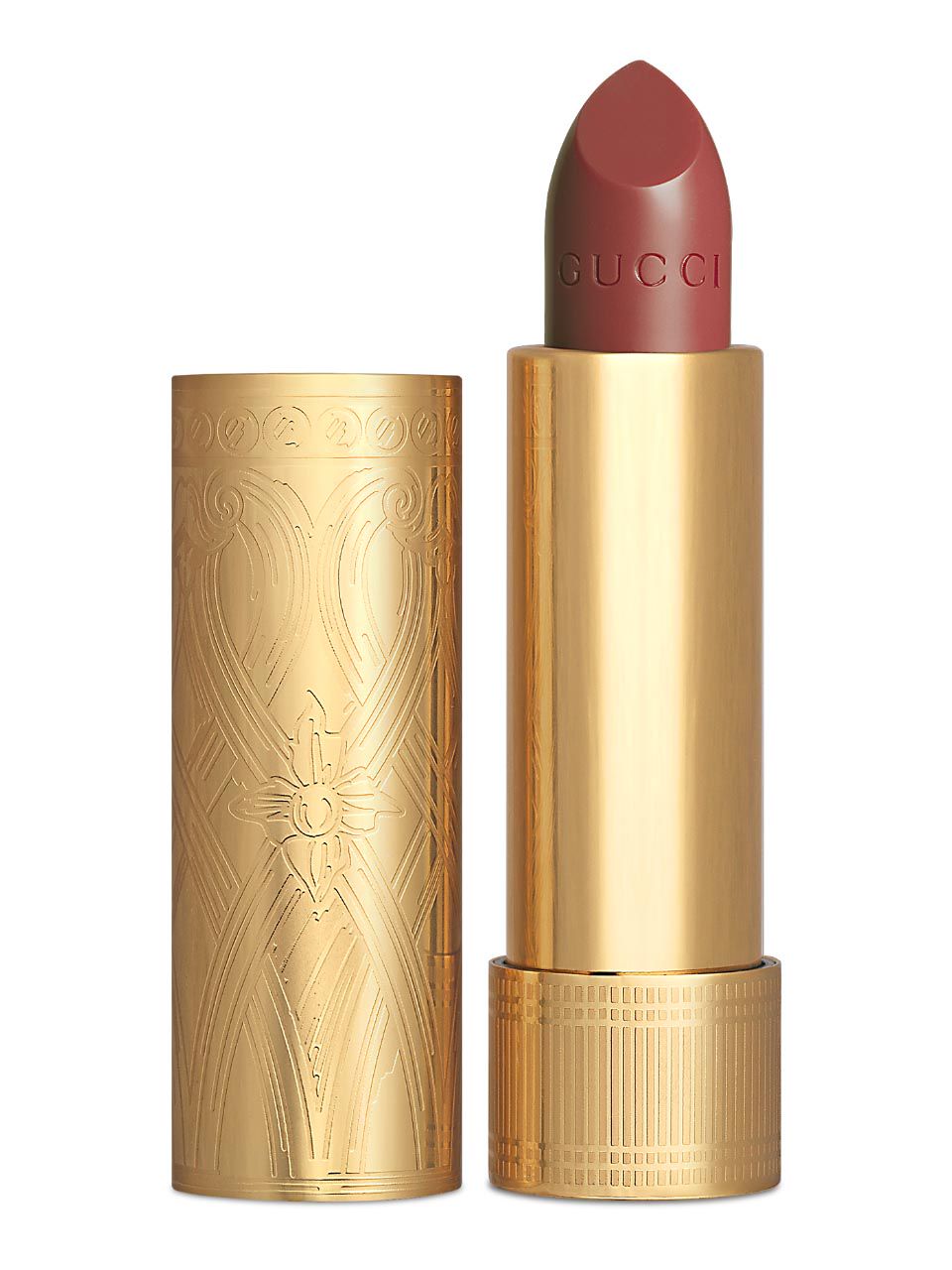 Gucci begins its new beauty story from the lips. A lipstick is the ultimate makeup tool, its fascination and desirability a result of its instant transformative power. Gucci’s three new lipstick collections are diverse formulations: Rouge à Lèvres Satin with a satin finish, Rouge à Lèvres Voile with a sheer finish, and Baume à Lèvres, a lip balm with a translucent finish. Rouge à Lèvres Satin is a creamy with intense colour lipstick. The formula delivers a perfect and long-lasting satin finish, that leaves lips smooth and soft, and is lightweight with a comfortable feel. The 36 shades sweep from nudes to reds to pinks, with nuances of orange and purple and an unexpected black hue. Inspired by vintage makeup the lipsticks’ packaging interweaves House motifs with contemporary codes. Packaged in a gold tube, Rouge à Lèvres Satin is etched with a decorative style drawn by Alessandro Michele that borrows its flair from Art Deco inspirations.