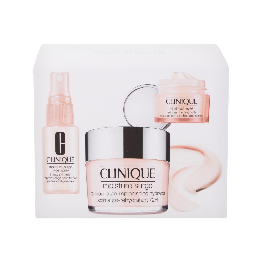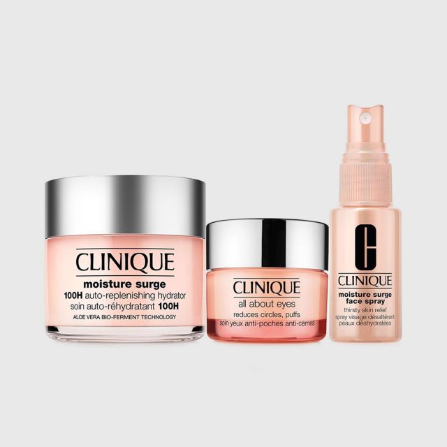 A set of Clinique Moisture Surge products for ultra hydration. The set includes a face wash, face spray, and moisturizer.